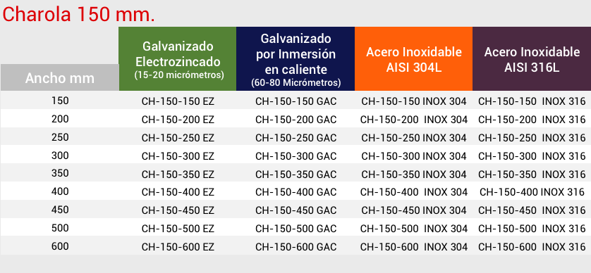 Charola tipo malla fabricada en acero al carb�n y acero inoxidable,electro soldada con doble hilo longitudinal y gancho de seguridad para evitar deflexi�n. Peralte 150